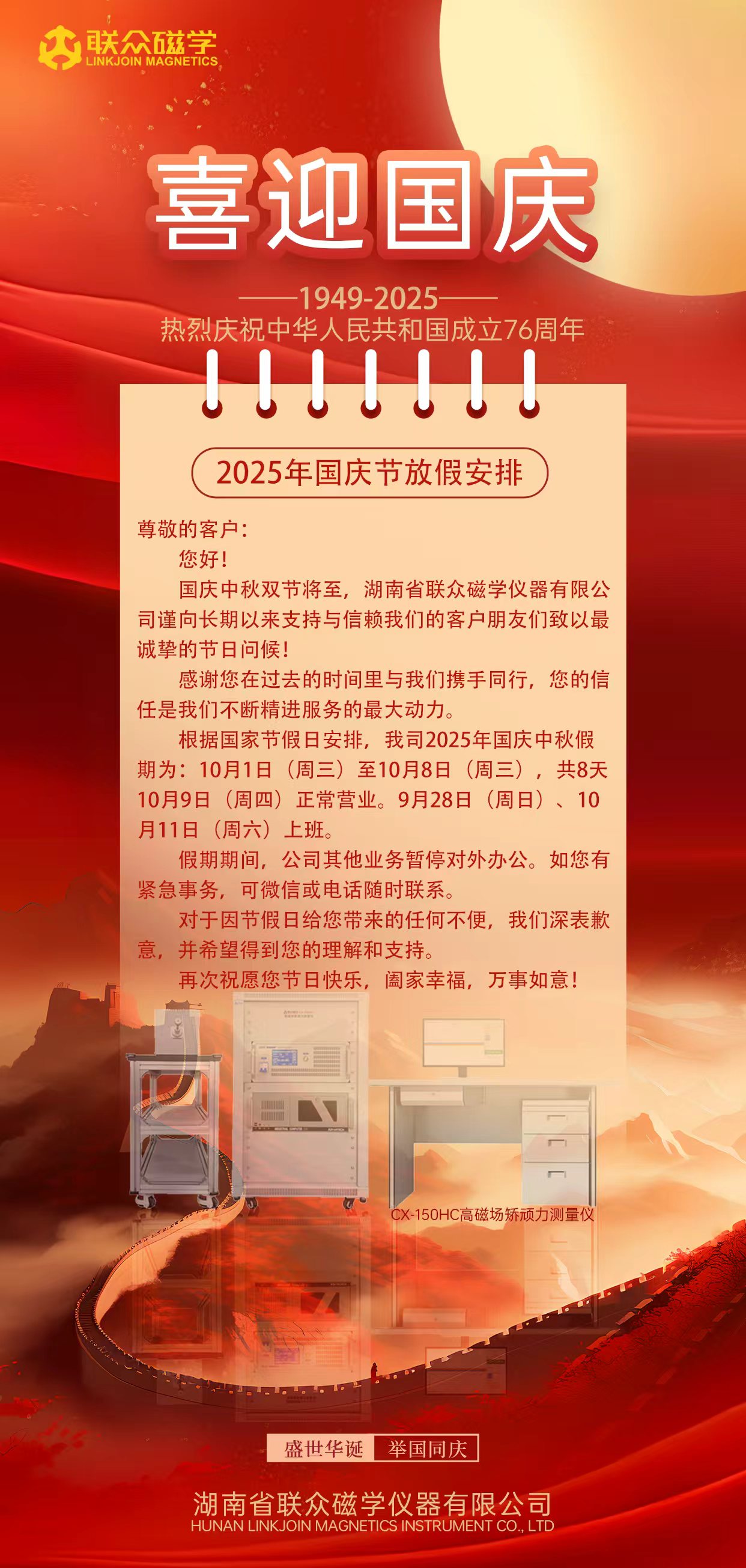 國(guó)慶中秋雙節(jié)將至,湖南省聯(lián)眾磁學(xué)儀器有限公司謹(jǐn)向長(zhǎng)期以來(lái)支持與信賴我們的客戶朋友們致以最誠(chéng)摯的節(jié)日問(wèn)候!